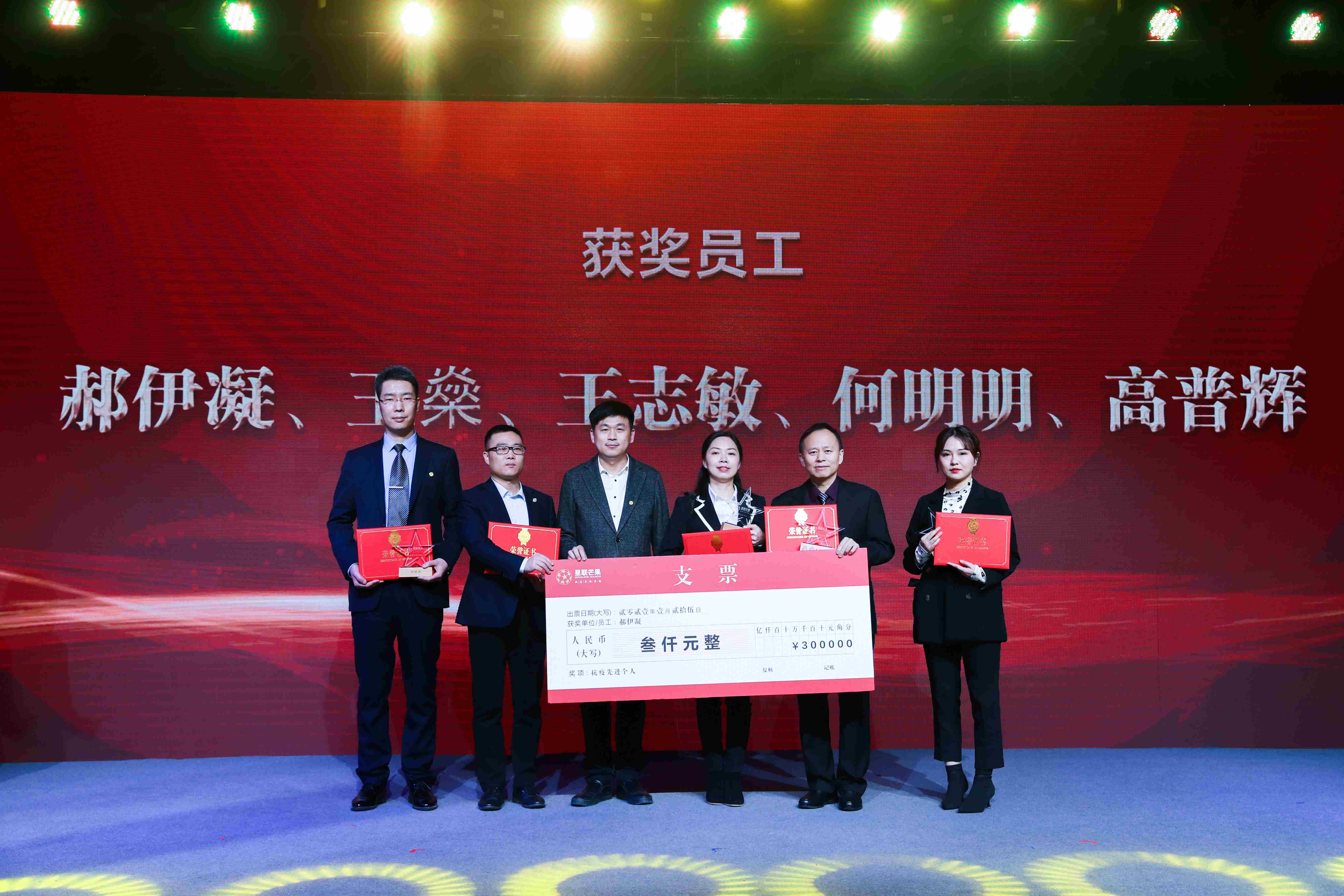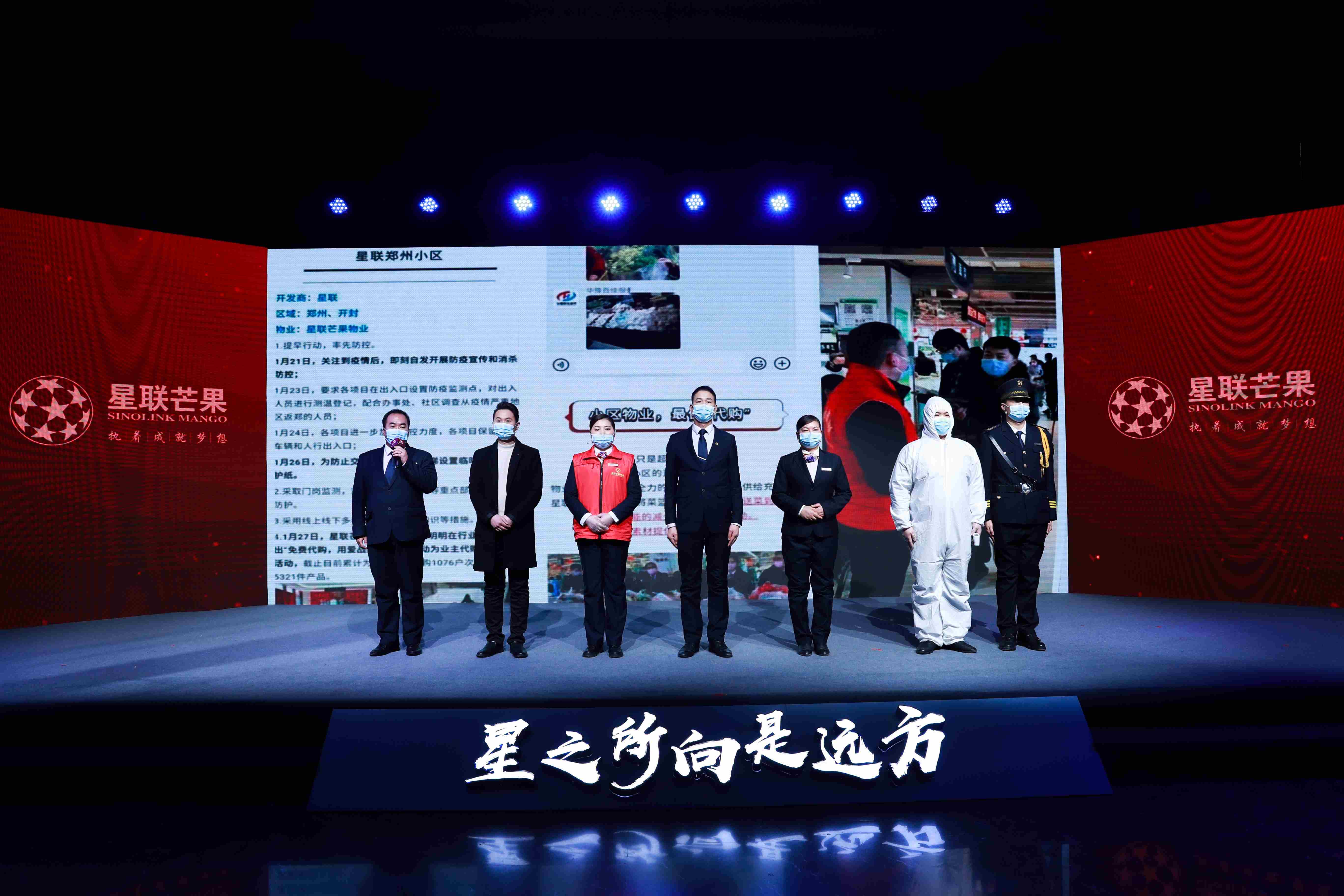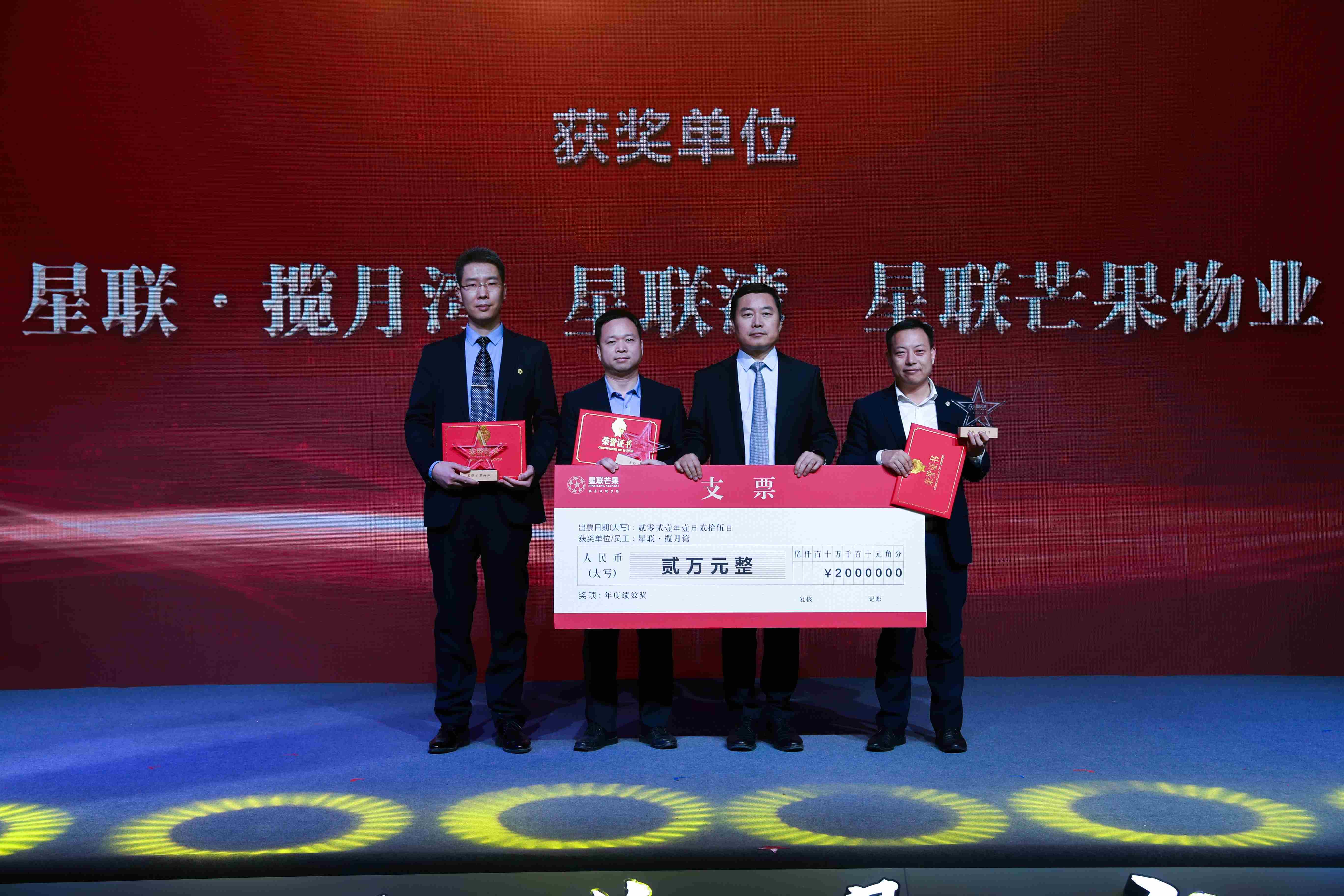 年會現場,共頒發董事長特別獎、年度質量獎、年度績效獎、年度成本獎、年度物業服務獎、年度最佳案場獎、年度管理獎、星聯文化獎、金牌員工獎、優秀共產黨員、抗疫先進個人、抗疫先進集體等14項榮譽獎項,集團領導上臺為他們一一頒發榮譽證書和獎杯,以表彰他們在過往一年里的辛勤付出。