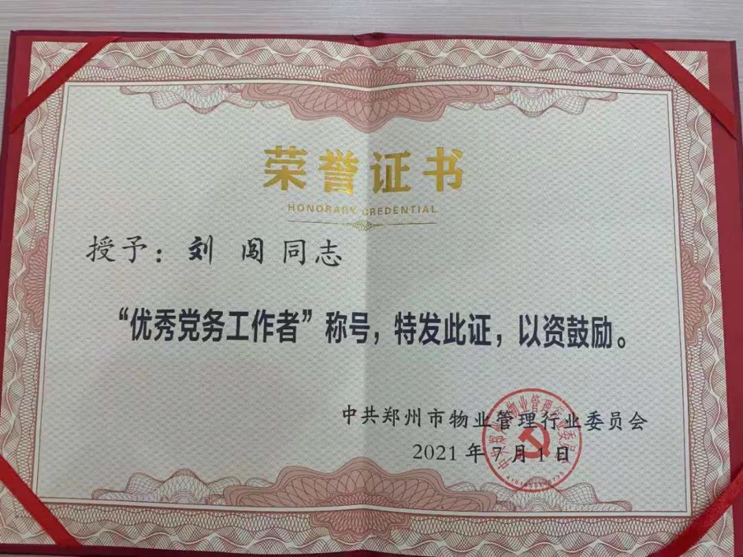 于此同時(shí),2021年6月,中共星聯(lián)芒果集團(tuán)有限公司第二支部陳新院同志、劉闖同志分別被鄭州市物業(yè)協(xié)會(huì)授予“優(yōu)秀共產(chǎn)黨員”、“優(yōu)秀黨務(wù)工作者”稱號(hào)。6月29日,在鄭東新區(qū)“兩優(yōu)一先”表彰大會(huì)上,星聯(lián)芒果集團(tuán)黨總支再次獲評(píng)“先進(jìn)基層黨組織”榮譽(yù)稱號(hào)。