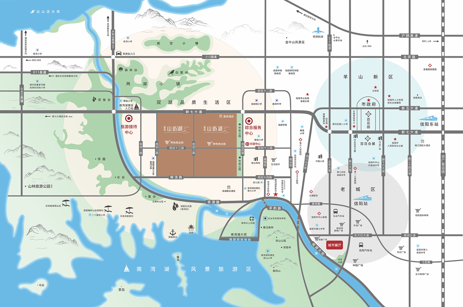 休閑-東側為4萬平規劃中市政公園,距離南灣湖風景區新入口僅1KM,周邊環繞開元文旅小鎮、兩湖小鎮、東航小鎮,向北15公里直達俗稱“信陽網紅大海”的出山店水庫