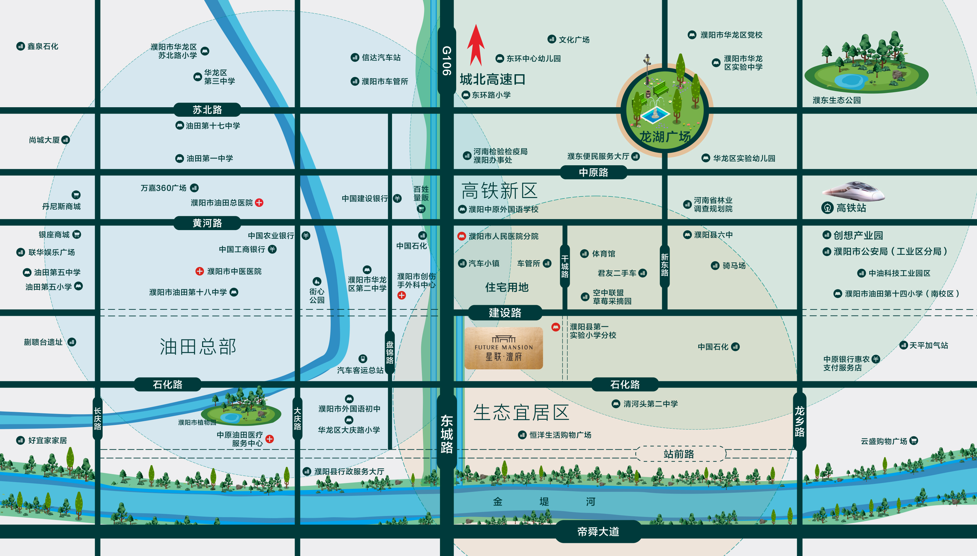 休閑-東北角規劃約300畝現代化的體育館,向西街心公園,金堤河水系圍繞